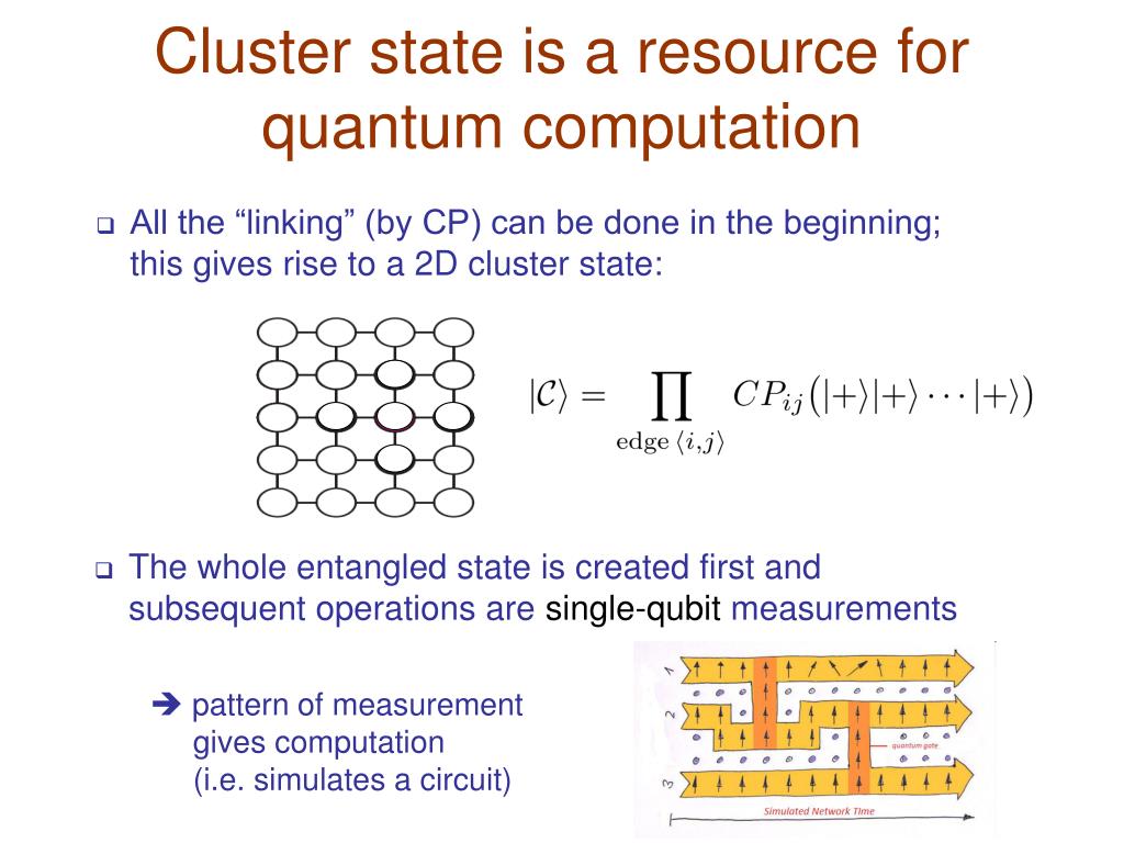 Cluster state is a resource for quantum computation • All the “linking” (by CP) can be done in the beginning; this gives rise to a 2D cluster state: • The whole entangled state is created first and subsequent operations are single-qubit measurements pattern of measurement gives computation (i.e. simulates a circuit)