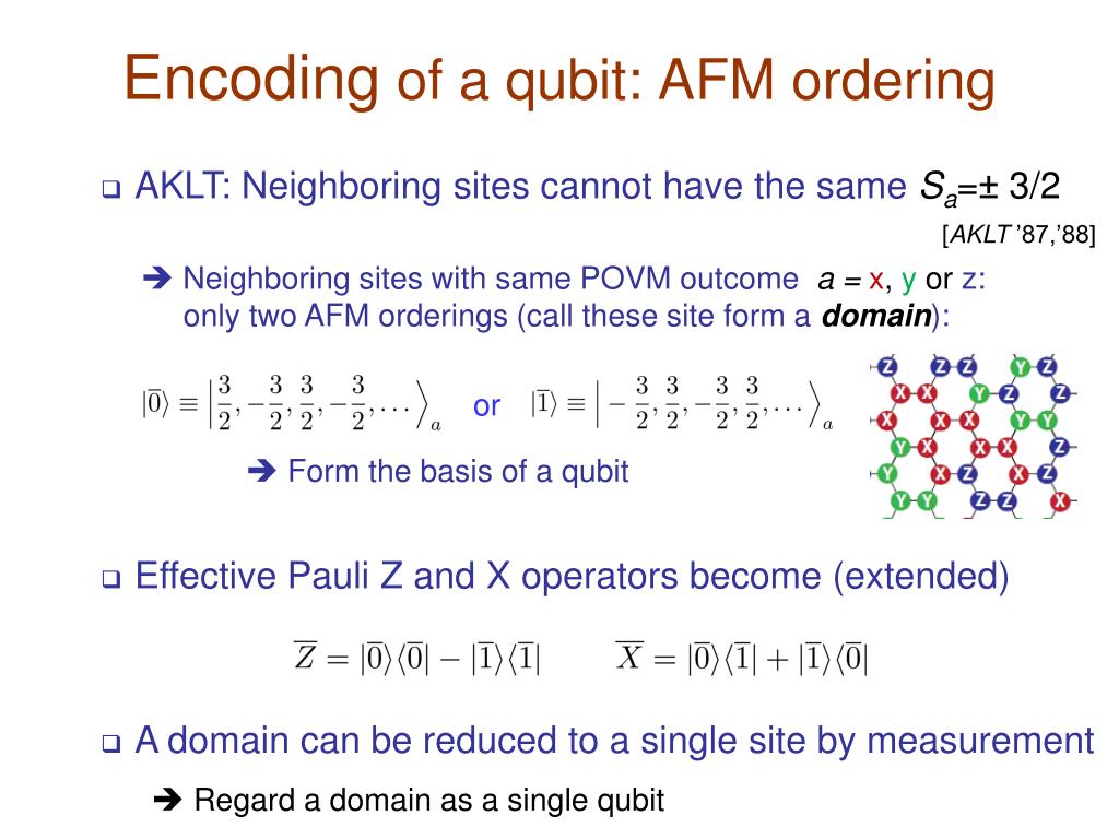 Encoding of a qubit: AFM ordering • AKLT: Neighboring sites cannot have the same Sa=± 3/2 [AKLT ’87,’88] Neighboring sites with same POVM outcome a =x, y or z: only two AFM orderings (call these site form a domain): or Form the basis of a qubit • Effective Pauli Z and X operators become (extended) • A domain can be reduced to a single site by measurement Regard a domain as a single qubit