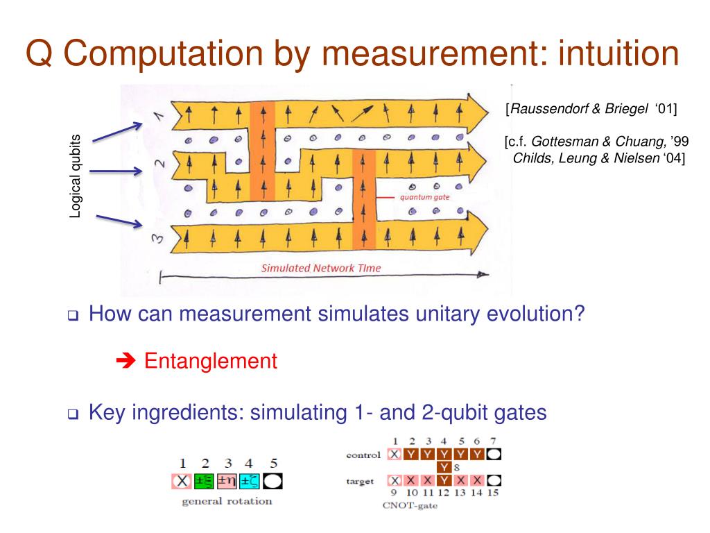 Q Computation by measurement: intuition [Raussendorf & Briegel ‘01] [c.f. Gottesman & Chuang, ’99Childs, Leung & Nielsen ‘04] Logical qubits • How can measurement simulates unitary evolution? Entanglement • Key ingredients: simulating 1- and 2-qubit gates