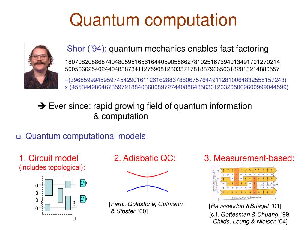 0/1 0 0 0/1 0 0 U Quantum computation Shor (’94): quantum mechanics enables fast factoring 1807082088687404805951656164405905566278102516769401349170127021450056662540244048387341127590812303371781887966563182013214880557 =(39685999459597454290161126162883786067576449112810064832555157243) x (45534498646735972188403686897274408864356301263205069600999044599) Ever since: rapid growing field of quantum information & computation • Quantum computational models 1. Circuit model (includes topological): 2. Adiabatic QC: 3. Measurement-based: [Farhi, Goldstone, Gutmann & Sipster ‘00] [Raussendorf &Briegel ‘01] [c.f. Gottesman & Chuang, ’99Childs, Leung & Nielsen ‘04]