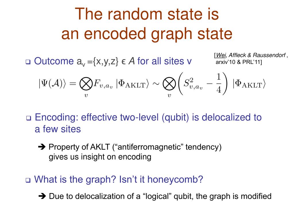 The random state is an encoded graph state [Wei, Affleck & Raussendorf , arxiv’10 & PRL’11] • Outcome av={x,y,z} ϵ Afor all sites v • Encoding: effective two-level (qubit) is delocalized to a few sites Property of AKLT (“antiferromagnetic” tendency) gives us insight on encoding • What is the graph? Isn’t it honeycomb? Due to delocalization of a “logical” qubit, the graph is modified