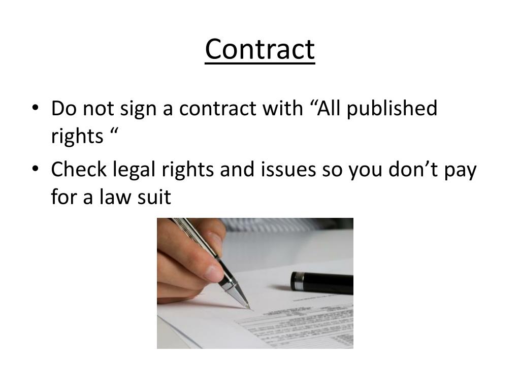 Contract • Do not sign a contract with “All published rights “ • Check legal rights and issues so you don’t pay for a law suit