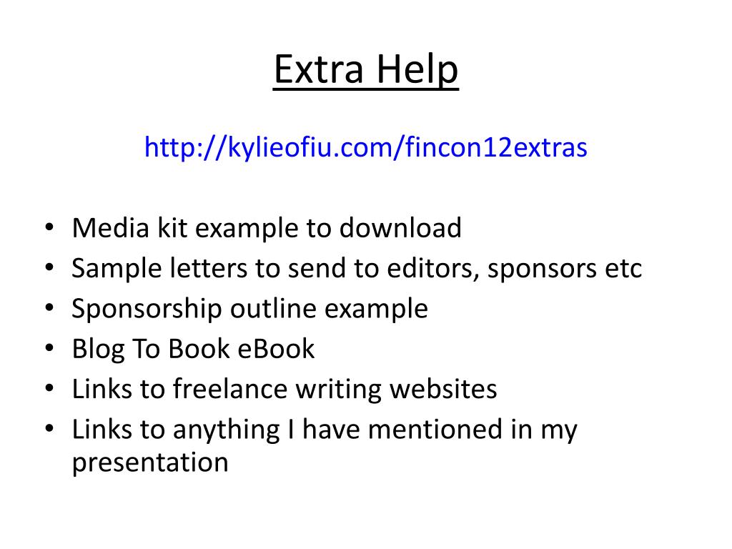Extra Help http://kylieofiu.com/fincon12extras • Media kit example to download • Sample letters to send to editors, sponsors etc • Sponsorship outline example • Blog To Book eBook • Links to freelance writing websites • Links to anything I have mentioned in my presentation