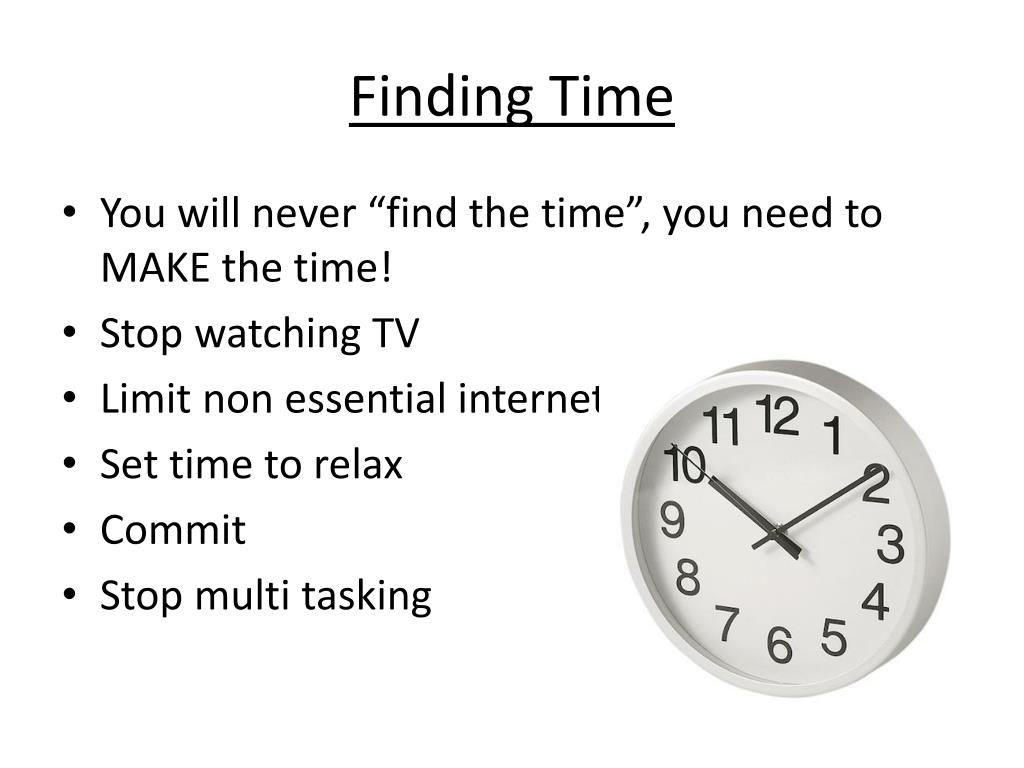 Finding Time • You will never “find the time”, you need to MAKE the time! • Stop watching TV • Limit non essential internet • Set time to relax • Commit • Stop multi tasking