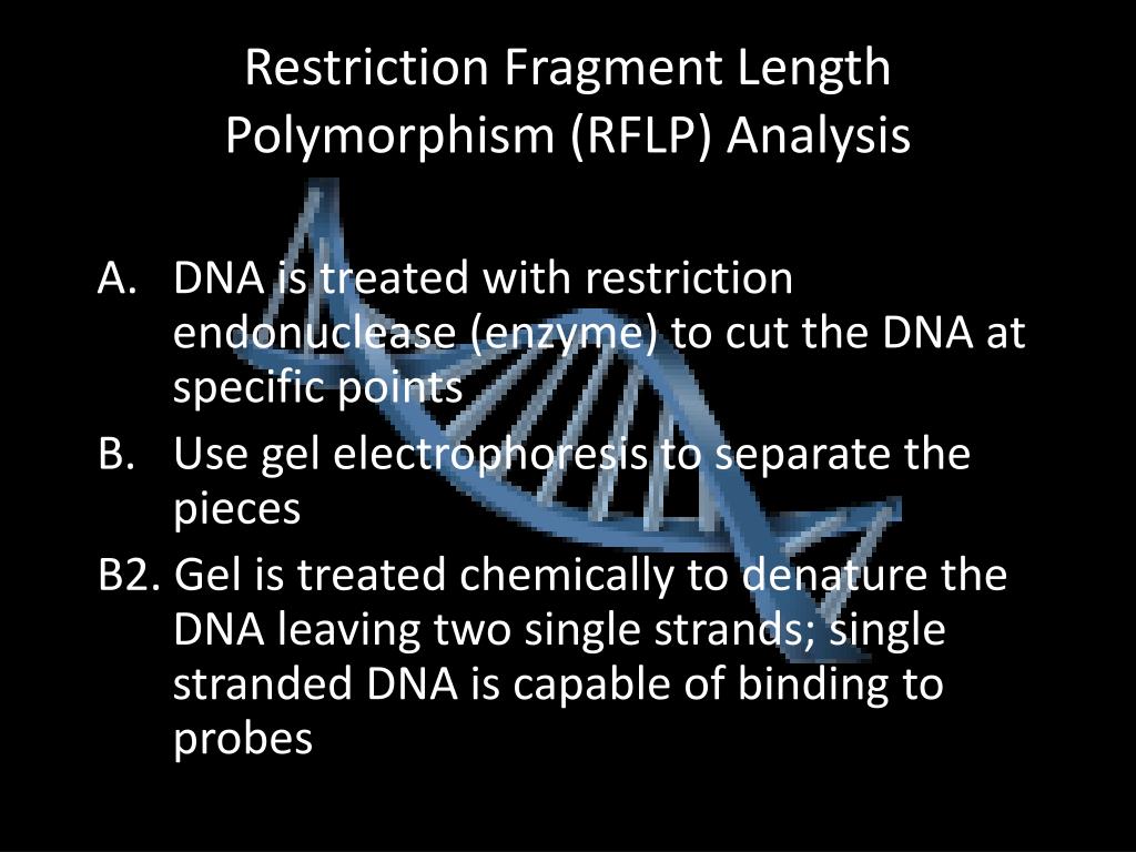 Restriction Fragment Length Polymorphism (RFLP) Analysis A. DNA is treated with restriction endonuclease (enzyme) to cut the DNA at specific points B. Use gel electrophoresis to separate the pieces B2. Gel is treated chemically to denature the DNA leaving two single strands; single stranded DNA is capable of binding to probes
