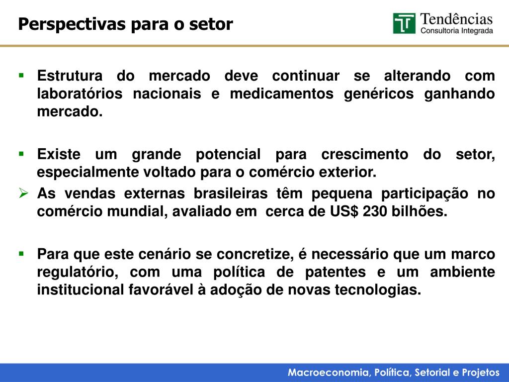 Perspectivas para o setor • Estrutura do mercado deve continuar se alterando com laboratórios nacionais e medicamentos genéricos ganhando mercado. • Existe um grande potencial para crescimento do setor, especialmente voltado para o comércio exterior. • As vendas externas brasileiras têm pequena participação no comércio mundial, avaliado em cerca de US$ 230 bilhões. • Para que este cenário se concretize, é necessário que um marco regulatório, com uma política de patentes e um ambiente institucional favorável à adoção de novas tecnologias.