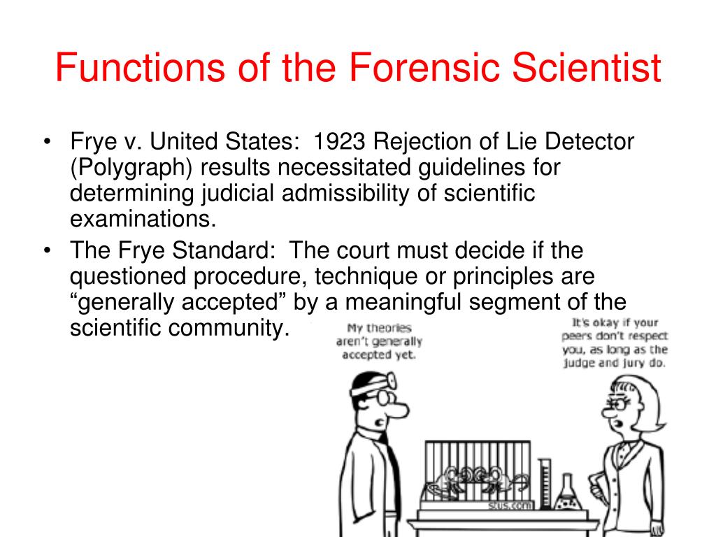 Functions of the Forensic Scientist • Frye v. United States: 1923 Rejection of Lie Detector (Polygraph) results necessitated guidelines for determining judicial admissibility of scientific examinations. • The Frye Standard: The court must decide if the questioned procedure, technique or principles are “generally accepted” by a meaningful segment of the scientific community.