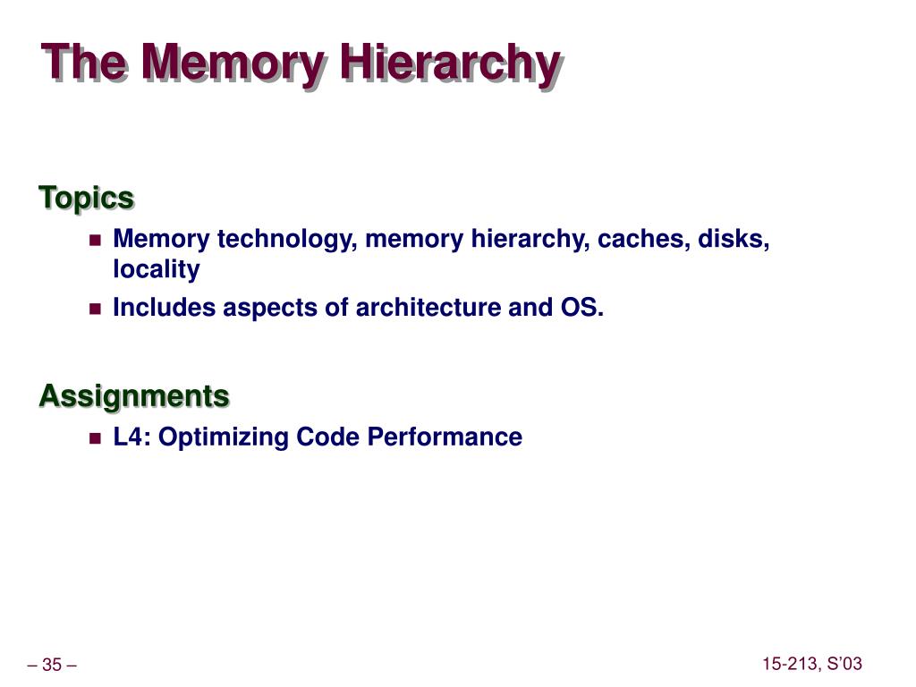 The Memory Hierarchy • Topics • Memory technology, memory hierarchy, caches, disks, locality • Includes aspects of architecture and OS. • Assignments • L4: Optimizing Code Performance