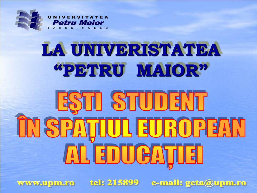 LA UNIVERISTATEA “PETRU MAIOR” EŞTI STUDENT ÎN SPAŢIUL EUROPEAN AL EDUCAŢIEI www.upm.ro tel: 215899 e-mail: geta@upm.ro