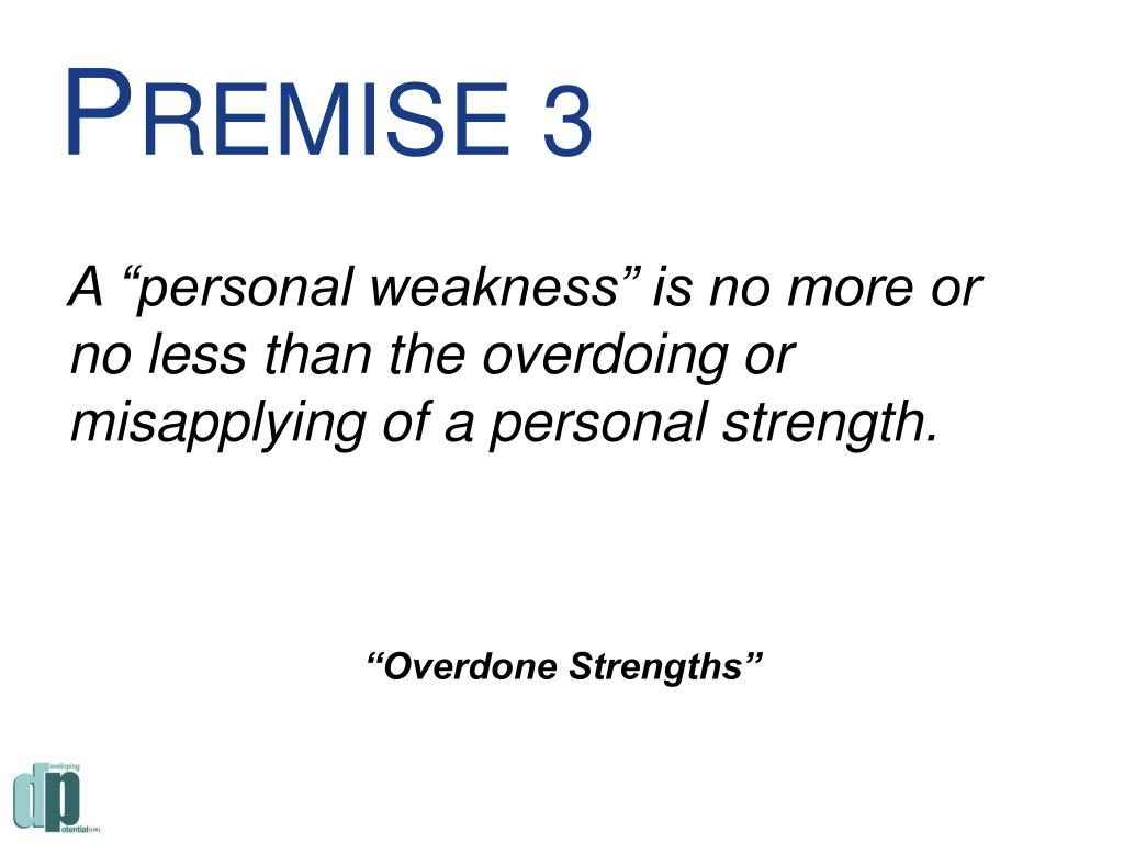 PREMISE 3 A “personal weakness” is no more or no less than the overdoing or misapplying of a personal strength. “Overdone Strengths”