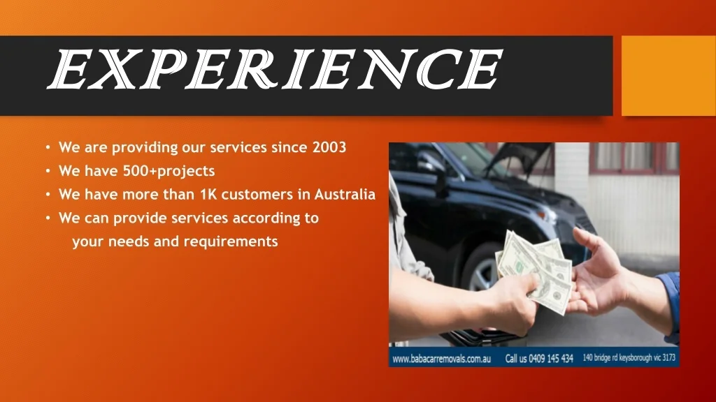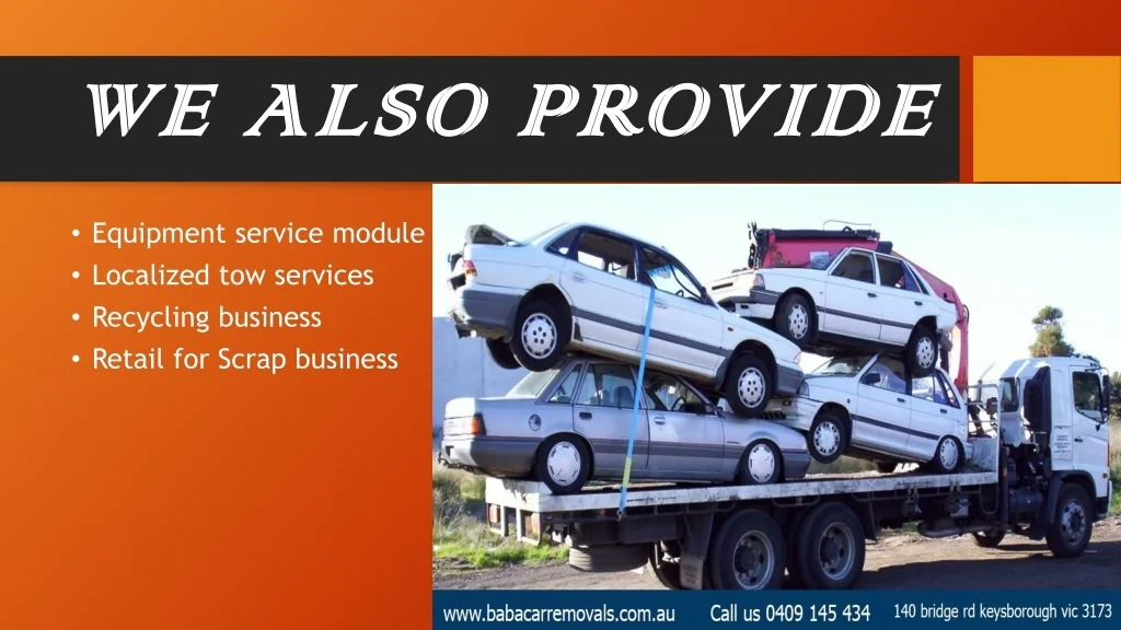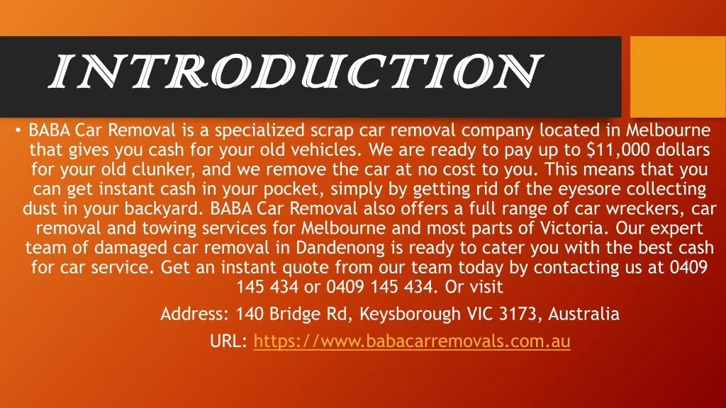 INTRODUCTION • BABA Car Removal is a specialized scrap car removal company located in Melbourne that gives you cash for your old vehicles. We are ready to pay up to $11,000 dollars for your old clunker, and we remove the car at no cost to you. This means that you can get instant cash in your pocket, simply by getting rid of the eyesore collecting dust in your backyard. BABA Car Removal also offers a full range of car wreckers, car removal and towing services for Melbourne and most parts of Victoria. Our expert team of damaged car removal in Dandenong is ready to cater you with the best cash for car service. Get an instant quote from our team today by contacting us at 0409 145 434 or 0409 145 434. Or visit Address: 140 Bridge Rd, Keysborough VIC 3173, Australia URL: https://www.babacarremovals.com.au