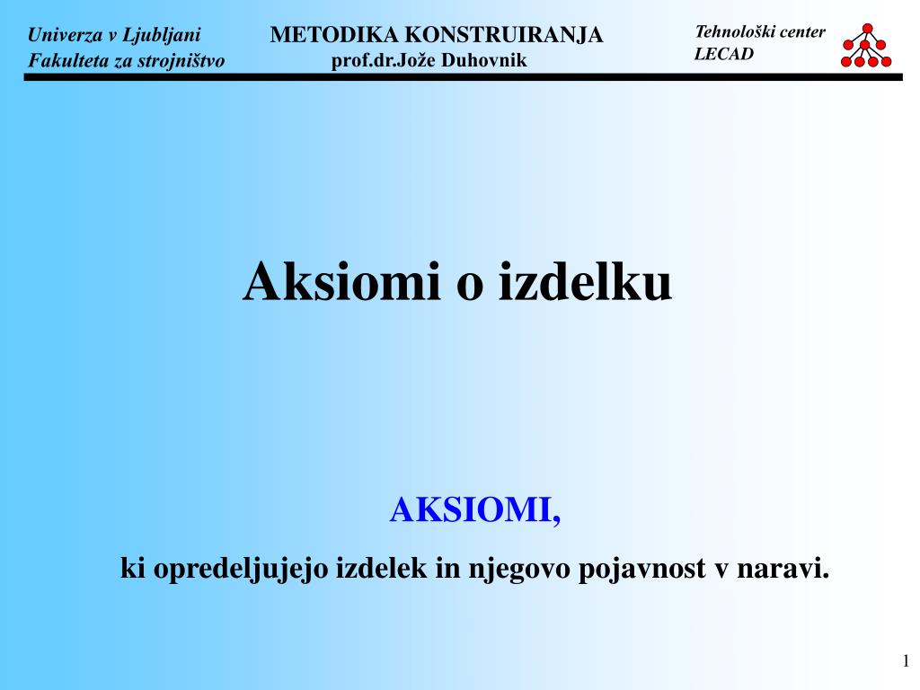 Aksiomi o izdelku AKSIOMI, ki opredeljujejo izdelek in njegovo pojavnost v naravi.