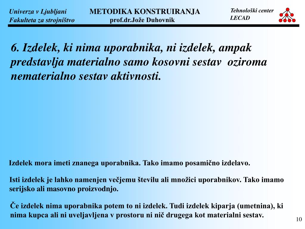 6. Izdelek, ki nima uporabnika, ni izdelek, ampak predstavlja materialno samo kosovni sestav oziroma nematerialno sestav aktivnosti. Izdelek mora imeti znanega uporabnika. Tako imamo posamično izdelavo. Isti izdelek je lahko namenjen večjemu številu ali množici uporabnikov. Tako imamo serijsko ali masovno proizvodnjo. Če izdelek nima uporabnika potem to ni izdelek. Tudi izdelek kiparja (umetnina), ki nima kupca ali ni uveljavljena v prostoru ni nič drugega kot materialni sestav.