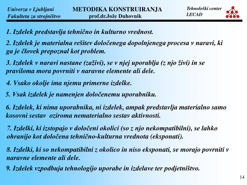 1. Izdelek predstavlja tehnično in kulturno vrednost. 2. Izdelek je materialna rešitev določenega dopolnjenega procesa v naravi, ki ga je človek prepoznal kot problem. 3. Izdelek v naravi nastane (zaživi), se v njej uporablja (z njo živi) in se praviloma mora povrniti v naravne elemente ali dele. 4. Vsako okolje ima njemu primerne izdelke. 5. Vsak izdelek je namenjen določenemu uporabniku. 6. Izdelek, ki nima uporabnika, ni izdelek, ampak predstavlja materialno samo kosovni sestav oziroma nematerialno sestav aktivnosti. 7. Izdelki, ki izstopajo v določeni okolici (so z njo nekompatibilni), se lahko ohranijo kot določena tehnično-kulturna vrednota (eksponati). 8. Izdelki, ki so nekompatibilni z okolico in niso eksponati, se morajo povrniti v naravne elemente ali dele. 9. Izdelek vzpodbuja tehnologijo uporabe in izdelave ter podjetništvo.