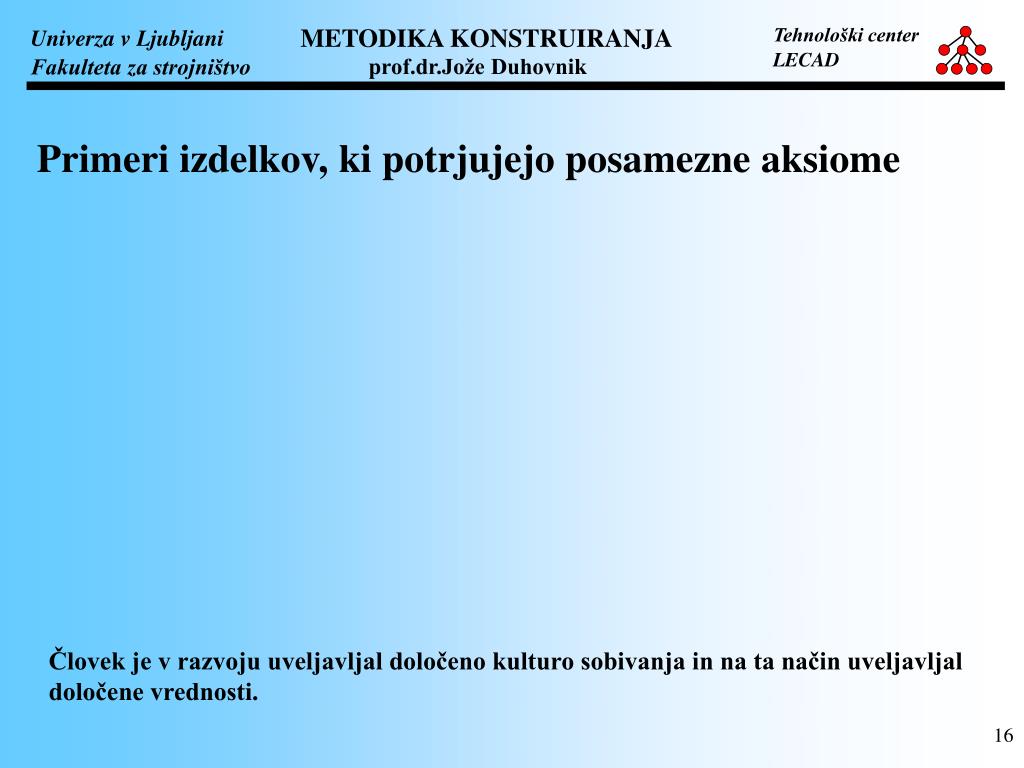 Primeri izdelkov, ki potrjujejo posamezne aksiome Človek je v razvoju uveljavljal določeno kulturo sobivanja in na ta način uveljavljal določene vrednosti.
