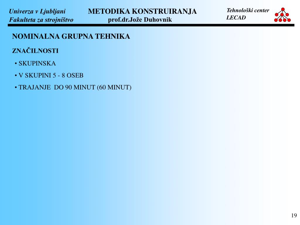 NOMINALNA GRUPNA TEHNIKA ZNAČILNOSTI • SKUPINSKA • V SKUPINI 5 - 8 OSEB • TRAJANJE DO 90 MINUT (60 MINUT)