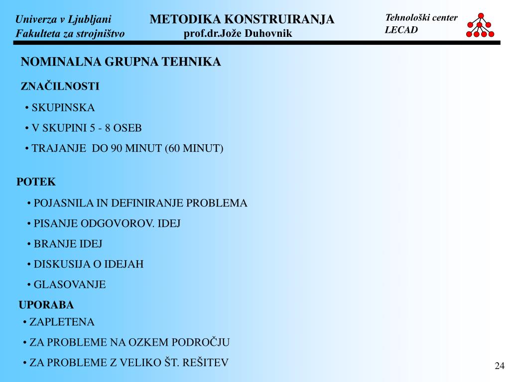 NOMINALNA GRUPNA TEHNIKA ZNAČILNOSTI • SKUPINSKA • V SKUPINI 5 - 8 OSEB • TRAJANJE DO 90 MINUT (60 MINUT) POTEK • POJASNILA IN DEFINIRANJE PROBLEMA • PISANJE ODGOVOROV. IDEJ • BRANJE IDEJ • DISKUSIJA O IDEJAH • GLASOVANJE UPORABA • ZAPLETENA • ZA PROBLEME NA OZKEM PODROČJU • ZA PROBLEME Z VELIKO ŠT. REŠITEV