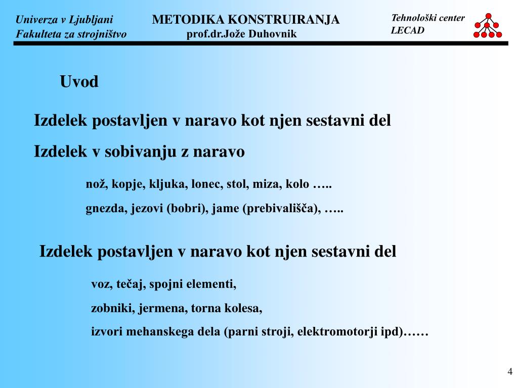 Uvod Izdelek postavljen v naravo kot njen sestavni del Izdelek v sobivanju z naravo nož, kopje, kljuka, lonec, stol, miza, kolo ….. gnezda, jezovi (bobri), jame (prebivališča), ….. Izdelek postavljen v naravo kot njen sestavni del voz, tečaj, spojni elementi, zobniki, jermena, torna kolesa, izvori mehanskega dela (parni stroji, elektromotorji ipd)……