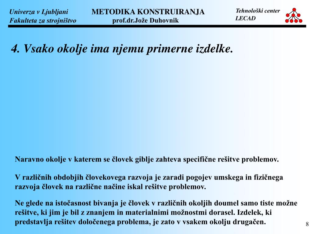4. Vsako okolje ima njemu primerne izdelke. Naravno okolje v katerem se človek giblje zahteva specifične rešitve problemov. V različnih obdobjih človekovega razvoja je zaradi pogojev umskega in fizičnega razvoja človek na različne načine iskal rešitve problemov. Ne glede na istočasnost bivanja je človek v različnih okoljih doumel samo tiste možne rešitve, ki jim je bil z znanjem in materialnimi možnostmi dorasel. Izdelek, ki predstavlja rešitev določenega problema, je zato v vsakem okolju drugačen.