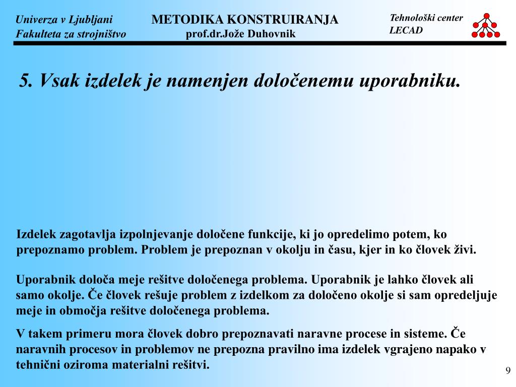 5. Vsak izdelek je namenjen določenemu uporabniku. Izdelek zagotavlja izpolnjevanje določene funkcije, ki jo opredelimo potem, ko prepoznamo problem. Problem je prepoznan v okolju in času, kjer in ko človek živi. Uporabnik določa meje rešitve določenega problema. Uporabnik je lahko človek ali samo okolje. Če človek rešuje problem z izdelkom za določeno okolje si sam opredeljuje meje in območja rešitve določenega problema. V takem primeru mora človek dobro prepoznavati naravne procese in sisteme. Če naravnih procesov in problemov ne prepozna pravilno ima izdelek vgrajeno napako v tehnični oziroma materialni rešitvi.