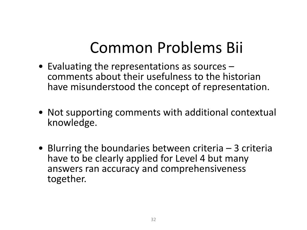 Common Problems Bii • Evaluating the representations as sources – comments about their usefulness to the historian have misunderstood the concept of representation. • Not supporting comments with additional contextual knowledge. • Blurring the boundaries between criteria – 3 criteria have to be clearly applied for Level 4 but many answers ran accuracy and comprehensiveness together.