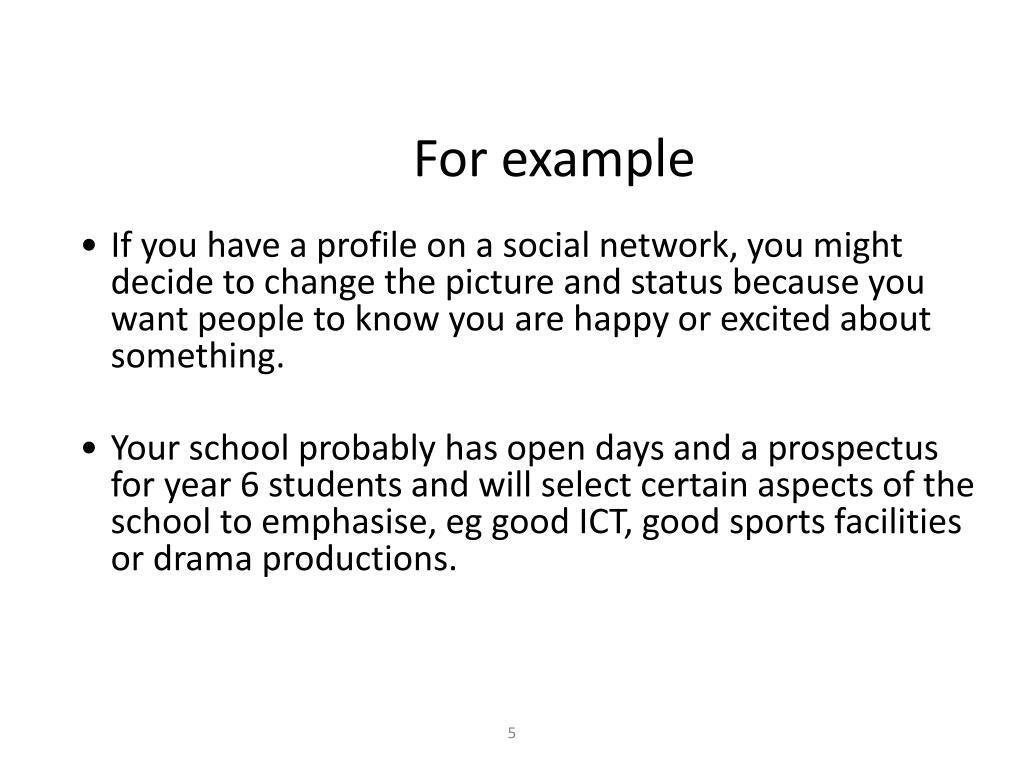 For example • If you have a profile on a social network, you might decide to change the picture and status because you want people to know you are happy or excited about something. • Your school probably has open days and a prospectus for year 6 students and will select certain aspects of the school to emphasise, eg good ICT, good sports facilities or drama productions.