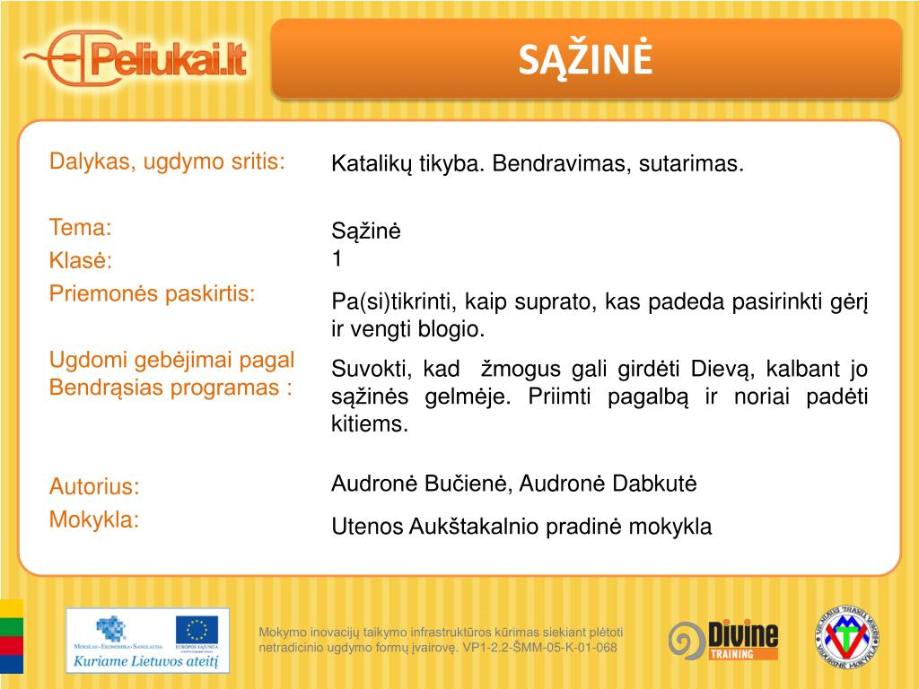 S ĄŽINĖ. Dalykas, ugdymo sritis: Tema: Klasė: Priemonės paskirtis: Ugdomi gebėjimai pagal Bendrąsias programas : Autorius: Mokykla:. Katalikų tikyba. Bendravimas , sutarimas . Sąžinė 1 Pa(si)tikrinti , kaip suprato, kas padeda pasirinkti gėrį ir vengti blogio.