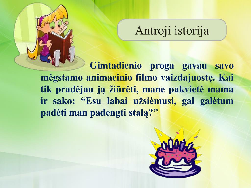 Antroji istorija Gimtadienio proga gavau savo mėgstamo animacinio filmo vaizdajuostę. Kai tik pradėjau ją žiūrėti, mane pakvietė mama ir sako: “Esu labai užsiėmusi, gal galėtum padėti man padengti stalą?”