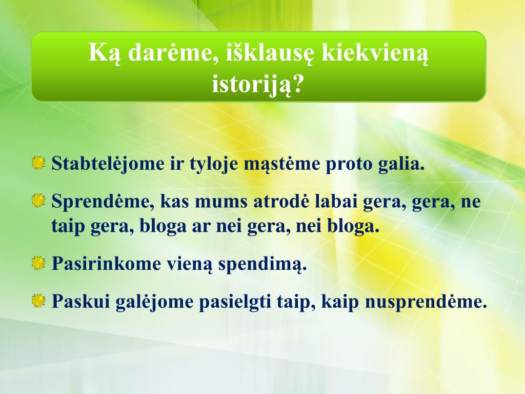 Ką darėme, išklausę kiekvieną istoriją? • Stabtelėjome ir tyloje mąstėme proto galia. • Sprendėme, kas mums atrodė labai gera, gera, ne taip gera, bloga ar nei gera,nei bloga. • Pasirinkome vieną spendimą. • Paskui galėjome pasielgti taip, kaip nusprendėme.