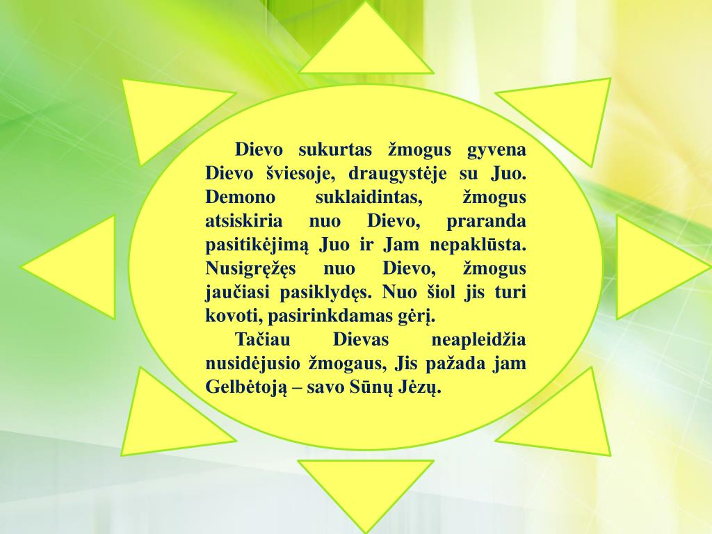 Dievo sukurtas žmogus gyvena Dievo šviesoje, draugystėje su Juo. Demono suklaidintas, žmogus atsiskiria nuo Dievo, praranda pasitikėjimą Juo ir Jam nepaklūsta. Nusigręžęs nuo Dievo, žmogus jaučiasi pasiklydęs. Nuo šiol jis turi kovoti, pasirinkdamas gėrį. Tačiau Dievas neapleidžia nusidėjusio žmogaus, Jis pažada jam Gelbėtoją – savo Sūnų Jėzų.