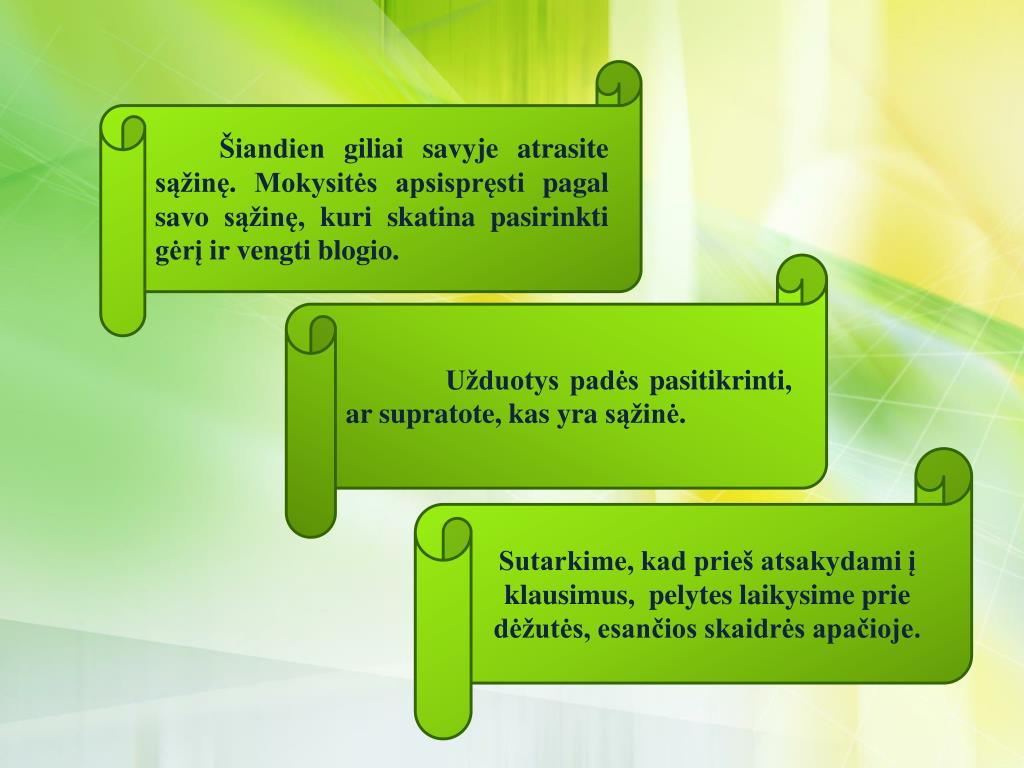 Šiandien giliai savyje atrasite sąžinę. Mokysitės apsispręsti pagal savo sąžinę, kuri skatina pasirinkti gėrį ir vengti blogio. Užduotys padės pasitikrinti, ar supratote, kas yra sąžinė. Sutarkime, kad prieš atsakydami į klausimus, pelytes laikysime prie dėžutės, esančios skaidrės apačioje.