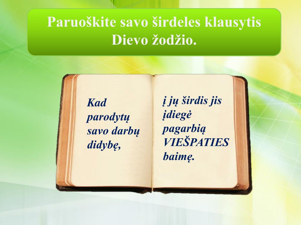 Paruoškitesavo širdeles klausytis Dievo žodžio. į jų širdis jis įdiegė pagarbią VIEŠPATIES baimę. Kad parodytų savo darbų didybę,