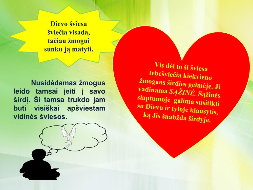 Dievo šviesa šviečia visada, tačiau žmogui sunku ją matyti. Vis dėl to ši šviesa tebešviečia kiekvieno žmogaus širdies gelmėje. Ji vadinama SĄŽINĖ. Sąžinės slaptumoje galima susitikti su Dievu ir tyloje klausytis, ką Jis šnabžda širdyje. Nusidėdamas žmogus leido tamsai įeiti į savo širdį. Ši tamsa trukdo jam būti visiškai apšviestam vidinės šviesos.