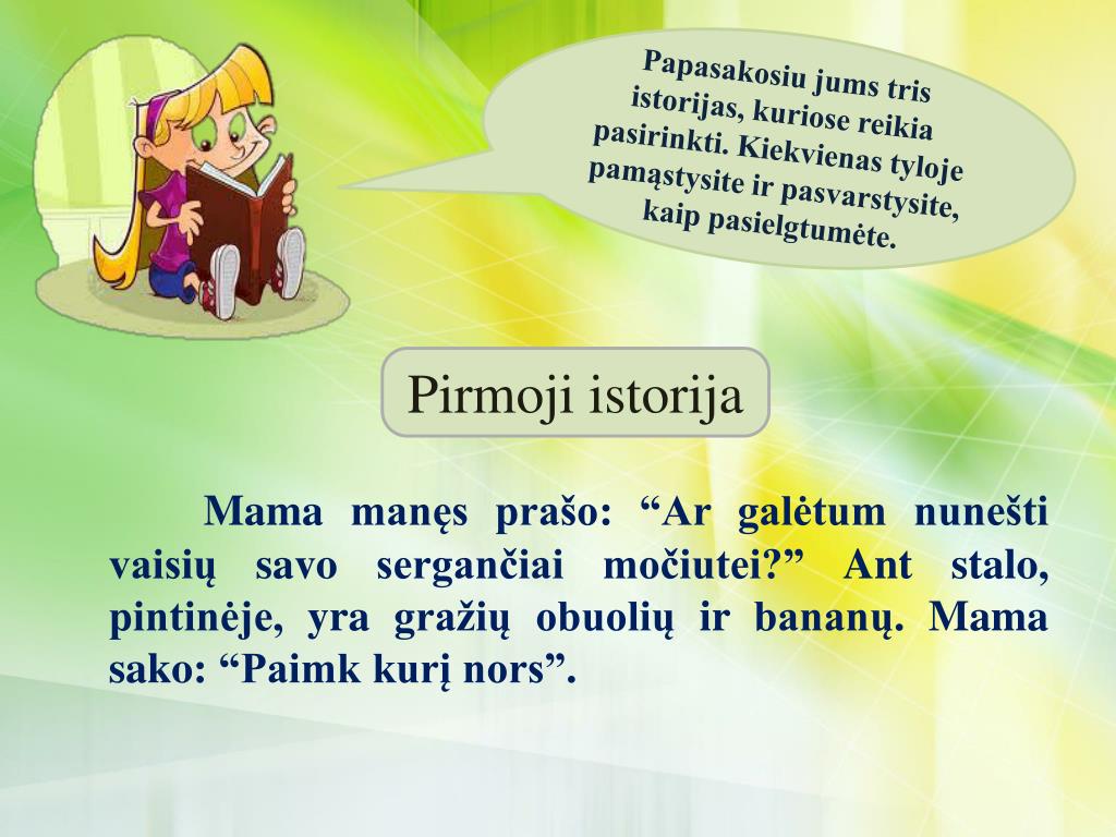 Papasakosiu jums tris istorijas, kuriose reikia pasirinkti. Kiekvienas tyloje pamąstysite ir pasvarstysite, kaip pasielgtumėte. Mama manęs prašo: “Ar galėtum nunešti vaisių savo sergančiai močiutei?” Ant stalo, pintinėje, yra gražių obuolių ir bananų. Mama sako: “Paimk kurį nors”. Pirmoji istorija