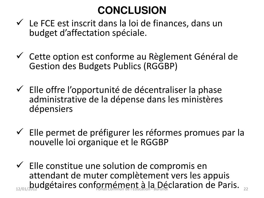 CONCLUSION • Le FCE est inscrit dans la loi de finances, dans un budget d’affectation spéciale. • Cette option est conforme au Règlement Général de Gestion des Budgets Publics (RGGBP) • Elle offre l’opportunité de décentraliser la phase administrative de la dépense dans les ministères dépensiers • Elle permet de préfigurer les réformes promues par la nouvelle loi organique et le RGGBP • Elle constitue une solution de compromis en attendant de muter complètement vers les appuis budgétaires conformément à la Déclaration de Paris. Fonds Commun de l'Education - Burundi