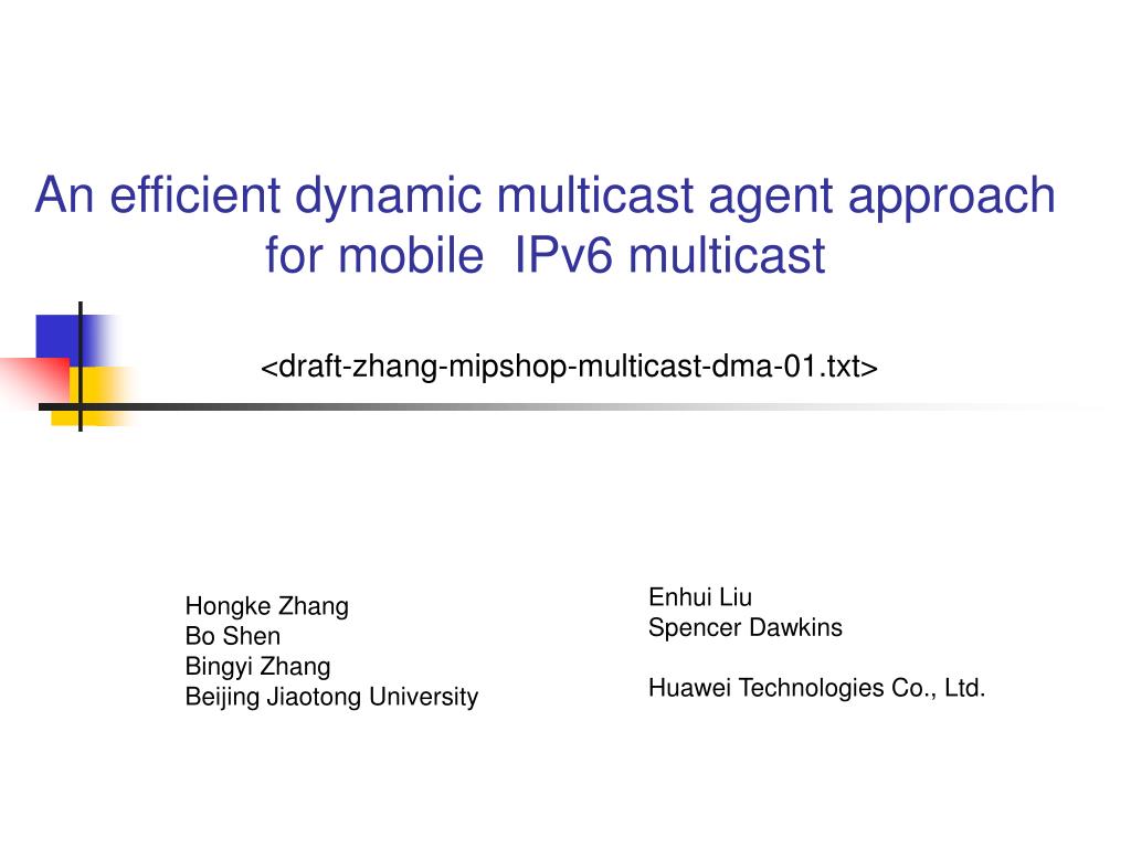 An efficient dynamic multicast agent approach for mobile IPv6 multicast <draft-zhang-mipshop-multicast-dma-01.txt> Enhui Liu Spencer Dawkins Huawei Technologies Co., Ltd. Hongke Zhang Bo Shen Bingyi Zhang Beijing Jiaotong University