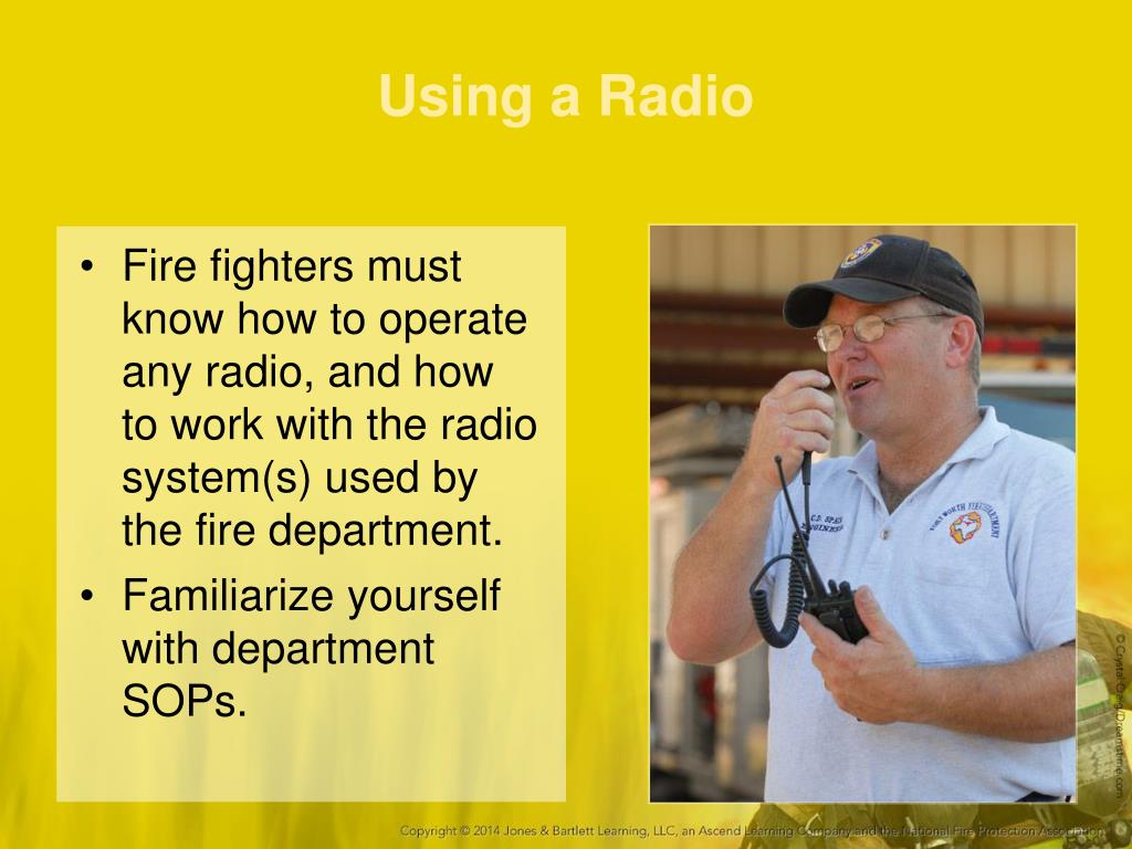 Using a Radio • Fire fighters must know how to operate any radio, and how to work with the radio system(s) used by the fire department. • Familiarize yourself with department SOPs.