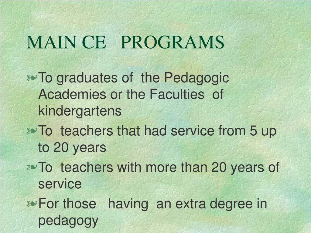 MAIN CE PROGRAMS • To graduates of the Pedagogic Academies or the Faculties of kindergartens • To teachers that had service from 5 up to 20 years • To teachers with more than 20 years of service • For those having an extra degree in pedagogy