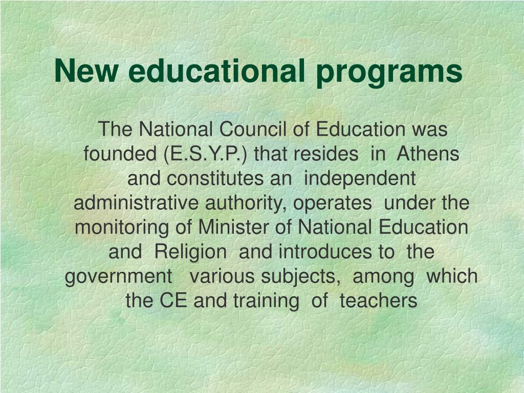 New educational programs The National Council of Education was founded (E.S.Y.P.) that resides in Athens and constitutes an independent administrative authority, operates under the monitoring of Minister of National Education and Religion and introduces to the government various subjects, among which the CE and training of teachers