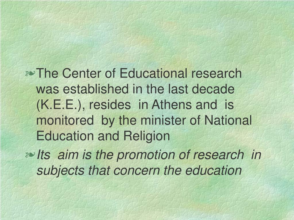 The Center of Educational research was established in the last decade (K.E.E.), resides in Athens and is monitored by the minister of National Education and Religion • Its aim is the promotion of research in subjects that concern the education