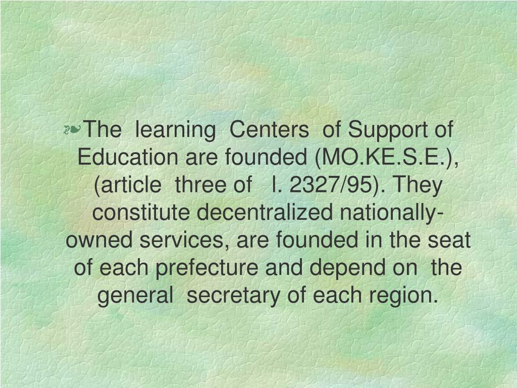 The learning Centers of Support of Education are founded (MO.KE.S.E.), (article three of l. 2327/95). They constitute decentralized nationally-owned services, are founded in the seat of each prefecture and depend on the general secretary of each region.