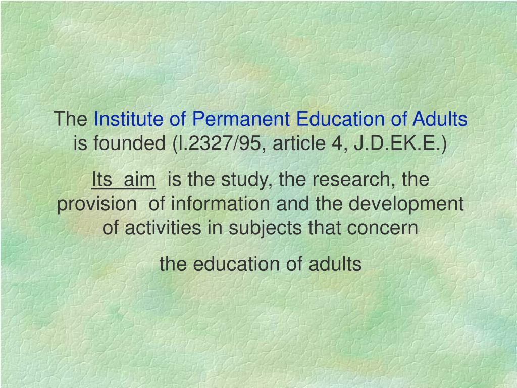 The Institute of Permanent Education of Adults is founded (l.2327/95, article 4, J.D.EK.E.) Its aim is the study, the research, the provision of information and the development of activities in subjects that concern the education of adults