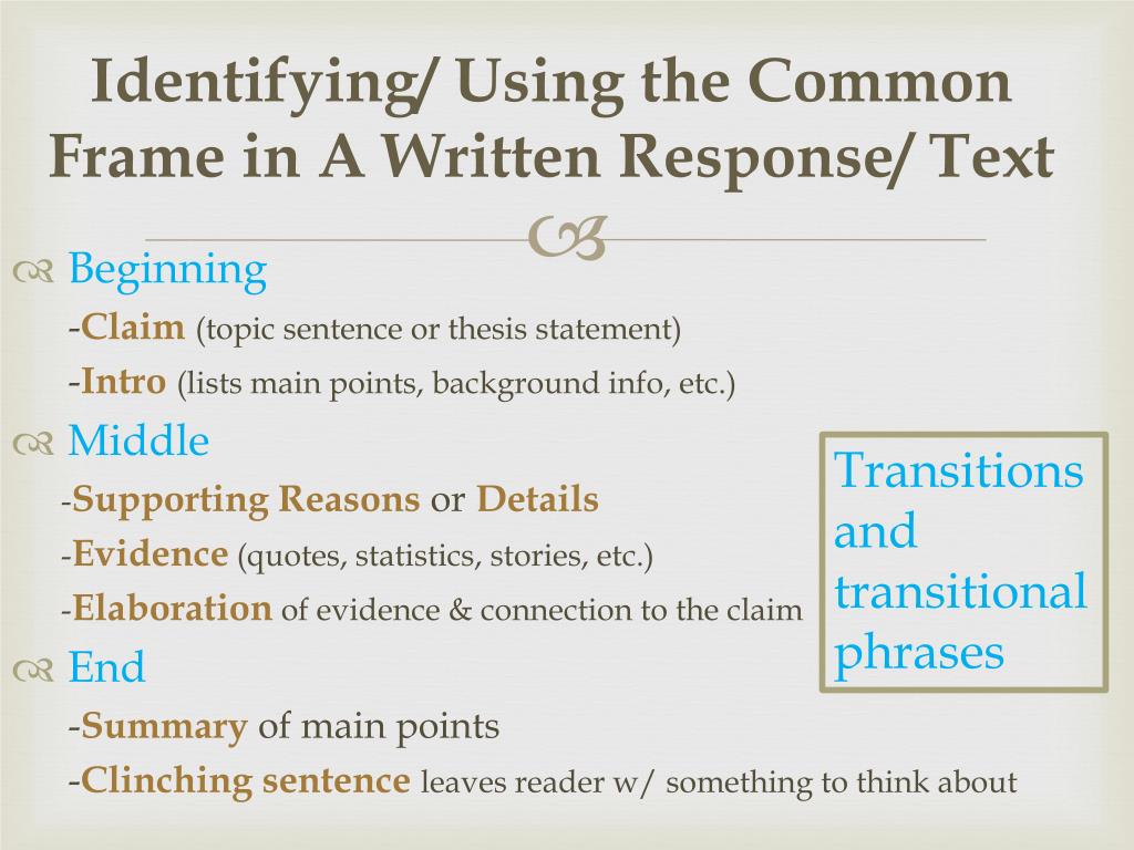 Identifying/ Using the Common Frame in A Written Response/ Text • Beginning -Claim (topic sentence or thesis statement) -Intro(lists main points, background info, etc.) • Middle -Supporting Reasons or Details -Evidence (quotes, statistics, stories, etc.) -Elaboration of evidence & connection to the claim • End -Summary of main points -Clinching sentence leaves reader w/ something to think about Transitions and transitional phrases