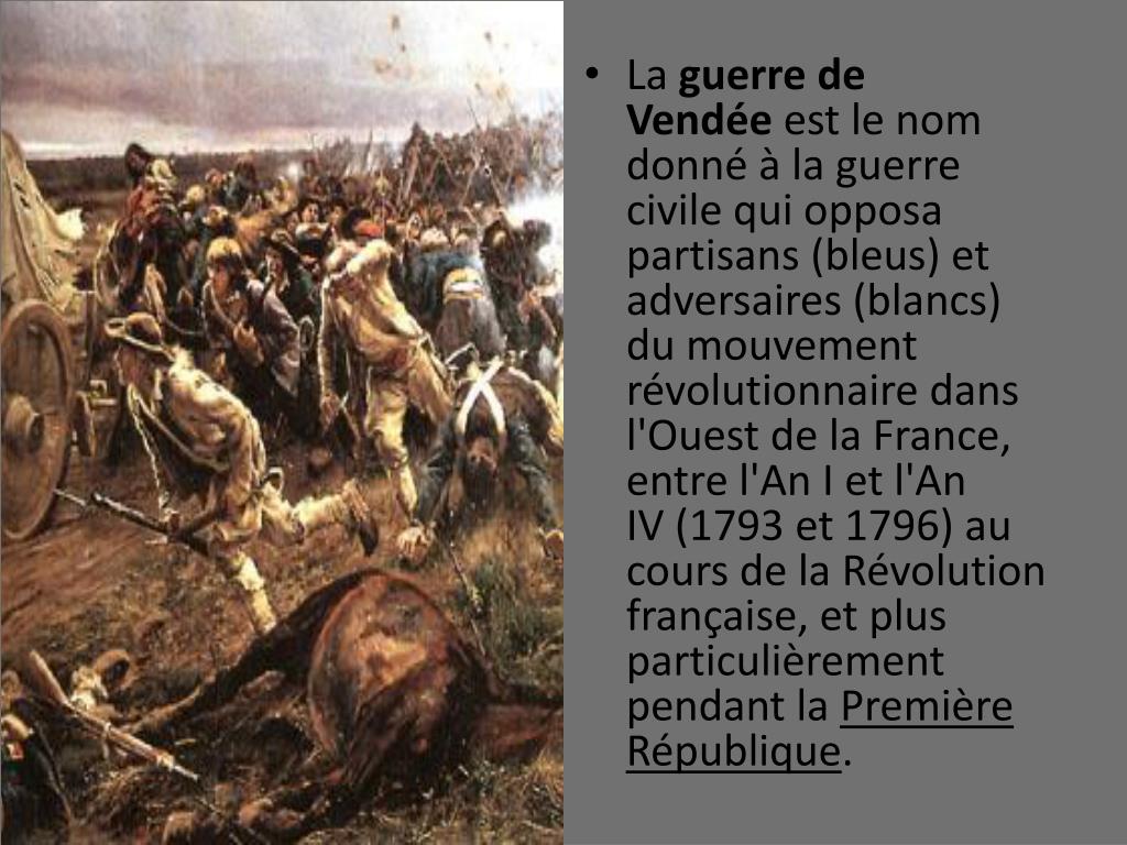La guerre de Vendée est le nom donné à la guerre civile qui opposa partisans (bleus) et adversaires (blancs) du mouvement révolutionnaire dans l'Ouest de la France, entre l'An I et l'An IV (1793 et 1796) au cours de la Révolution française, et plus particulièrement pendant la Première République.