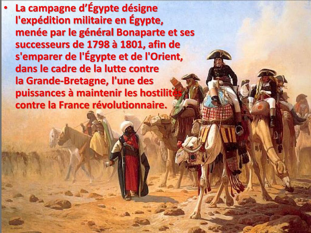 La campagne d’Égypte désigne l'expédition militaire en Égypte, menée par le général Bonaparte et ses successeurs de 1798 à 1801, afin de s'emparer de l'Égypte et de l'Orient, dans le cadre de la lutte contre la Grande-Bretagne, l'une des puissances à maintenir les hostilités contre la France révolutionnaire.