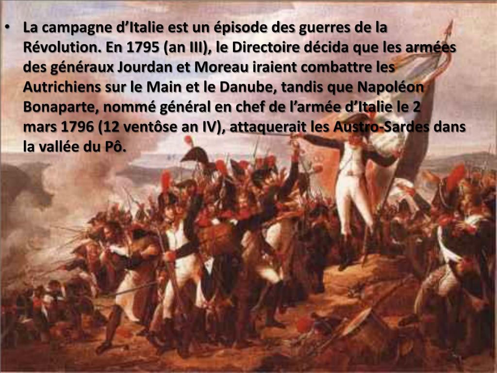 La campagne d’Italie est un épisode des guerres de la Révolution. En 1795 (an III), le Directoire décida que les armées des généraux Jourdan et Moreauiraient combattre les Autrichiens sur le Main et le Danube, tandis que Napoléon Bonaparte, nommé général en chef de l’armée d’Italie le 2 mars 1796 (12 ventôse an IV), attaquerait les Austro-Sardes dans la vallée du Pô.