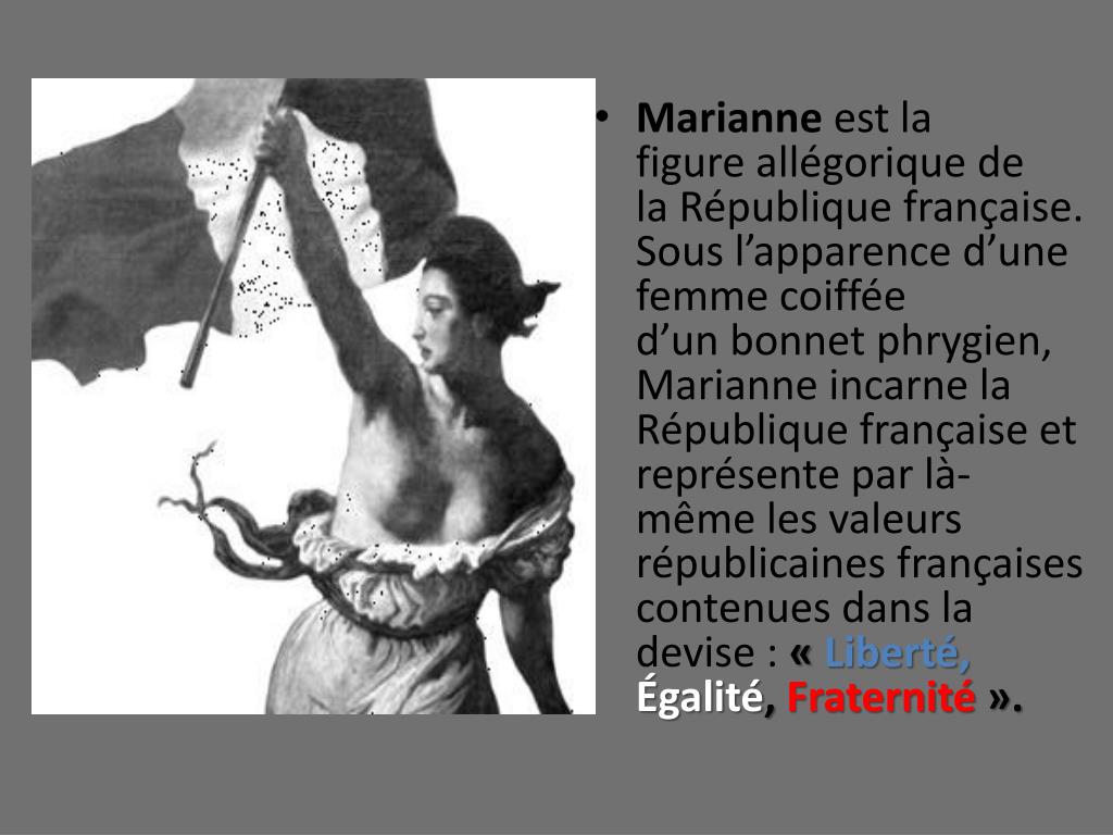 Marianne est la figure allégorique de la République française. Sous l’apparence d’une femme coiffée d’un bonnet phrygien, Marianne incarne la République française et représente par là-même les valeurs républicaines françaises contenues dans la devise : « Liberté,Égalité, Fraternité ».