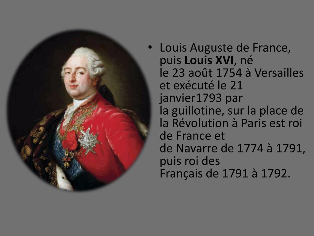 Louis Auguste de France, puis Louis XVI, né le 23 août 1754 à Versailles et exécuté le 21 janvier1793 par la guillotine, sur la place de la Révolution à Parisest roi de France et de Navarre de 1774 à 1791, puis roi des Français de 1791 à 1792.