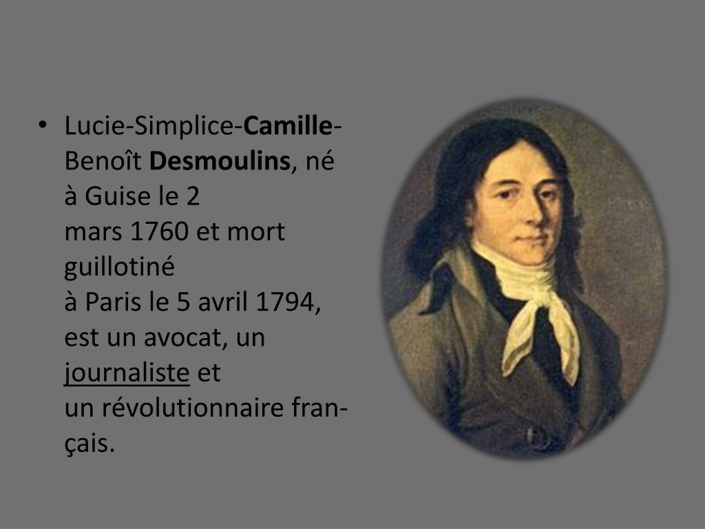 Lucie-Simplice-Camille-Benoît Desmoulins, né à Guise le 2 mars 1760 et mort guillotiné à Paris le 5 avril1794, est un avocat, unjournaliste et un révolutionnaire fran-çais.