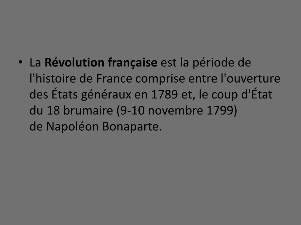 La Révolution française est la période de l'histoire de France comprise entre l'ouverture des États générauxen 1789 et, le coup d'État du 18 brumaire (9-10 novembre 1799) de Napoléon Bonaparte.